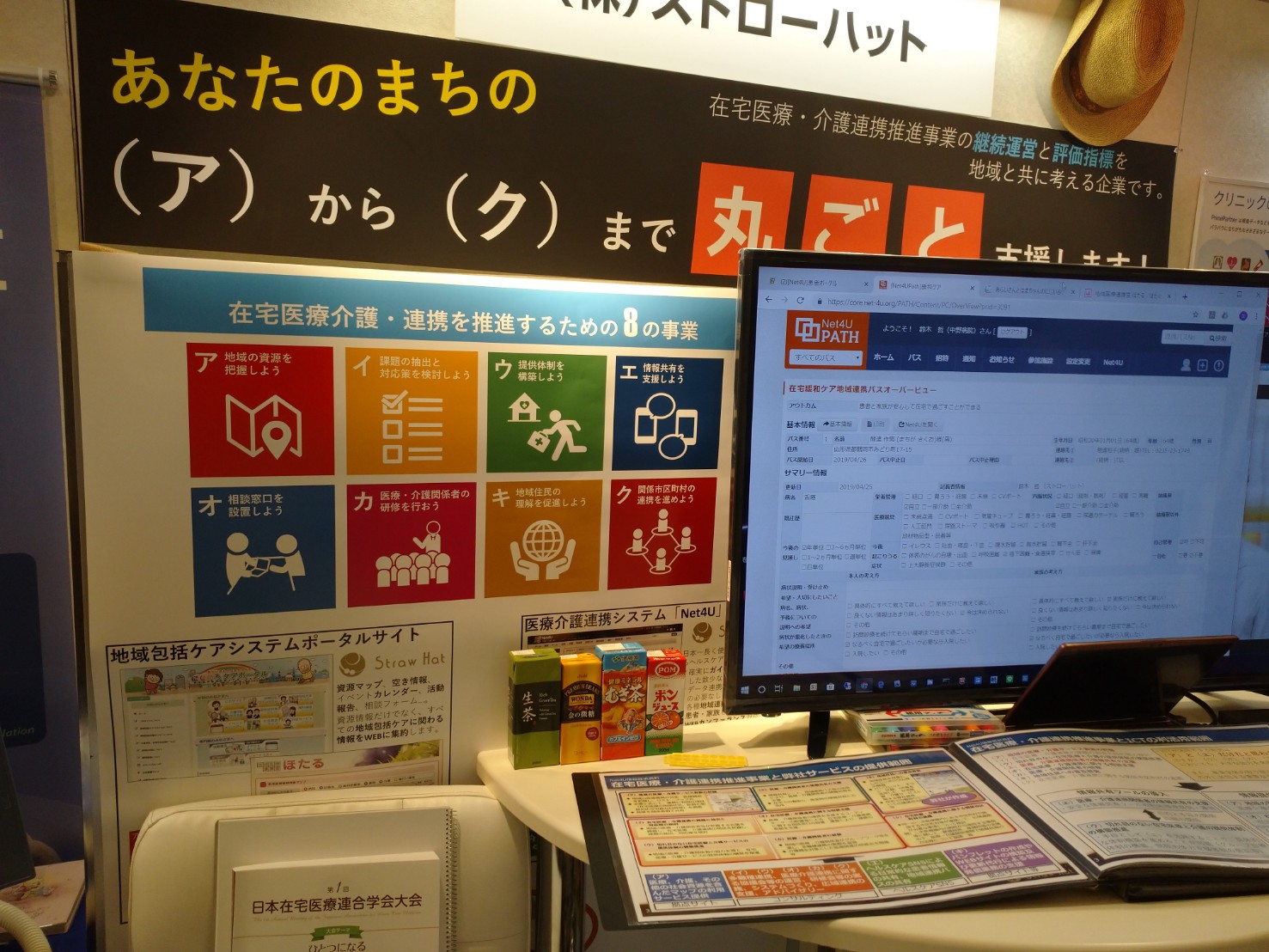 記念すべき第1回の連合学会ということもあり、弊社の展示内容も趣向を凝らし、主力サービスである医療介護連携システム「Net4U」に特化したものではなく、在宅医療・介護連携推進事業の(ア)から(ク)の全体を通して伴走支援する、システム、サービス、コンサルテーションによる統合ソリューションを展示してまいりました。