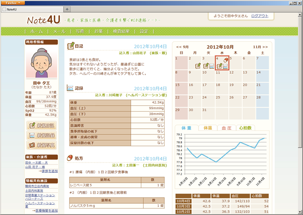 介護者、家族が日々の健康情報、介護情報を入力することができます。Net4U NOTEのみで表示され、Net4U COREには表示されません。